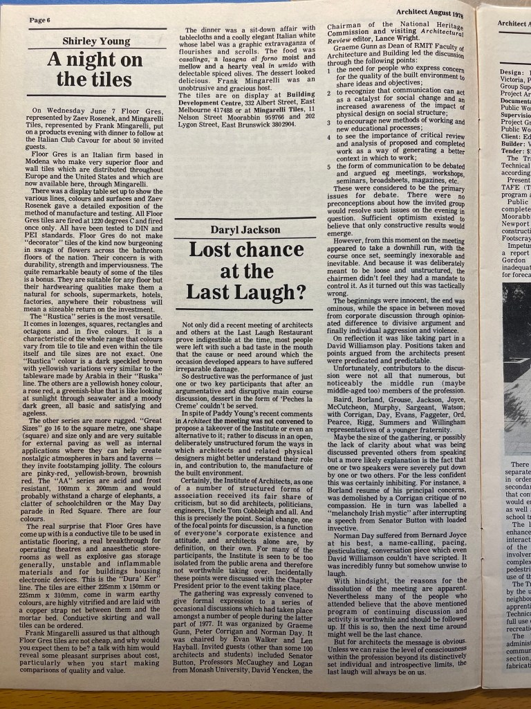 A meeting of architects in Melbourne at a popular comedy venue in 1978, ended in disarray. It should be no surprise, after all John Pinder’s Collingwood venue, which opened in 1976, was called, ‘The Last Laugh Theatre Restaurant and Zoo’. There were fisticuffs, yelling, hoodlum activity, violence, and a huge amount of drunkenness. People were damaged, some scarred, many heading for a hangover, and others simple rolling their eyes and wondering, ‘Where did that comet come from?” The proposal was to establish an alternative to the conservative RAIA from outside the organisation rather than within. But mayhem developed, probably in part due to there being no set agenda, and the event came to be inscribed in the mythologies of Melbourne architecture and culture as yet another failed uprising by a troublesome underbelly.